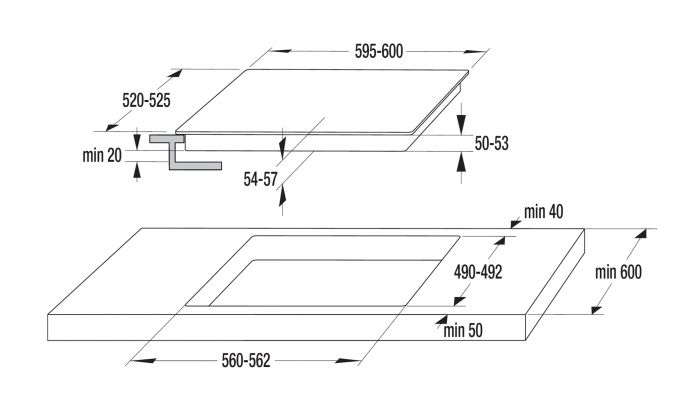Dimensions d’encastrement : env. 56 × 7 × 49 cm